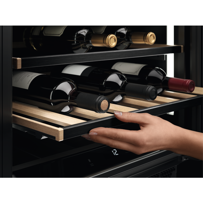 Винний холодильник має LED-освітлення всередині, яке красиво підсвічує колекцію, не впливаючи на температуру. Низький рівень шуму (~40 дБ) гарантує тиху роботу, а регульовані дерев’яні полиці й зворотні навішувальні дверцята забезпечують зручність використання і адаптацію під планування приміщення.